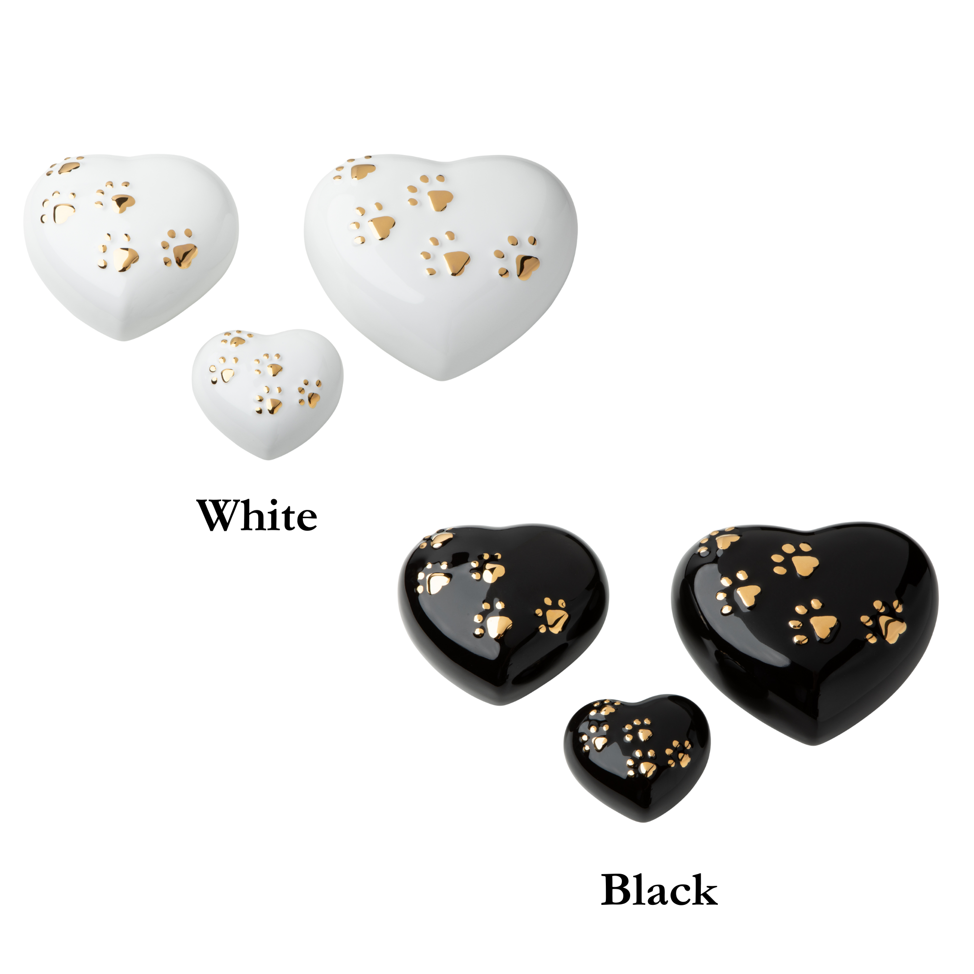 This heart-shaped ceramic urn has a lustrous finish with gold paw prints on it. It is hollow, allowing ashes to be placed inside of it. Available in 3 sizes.